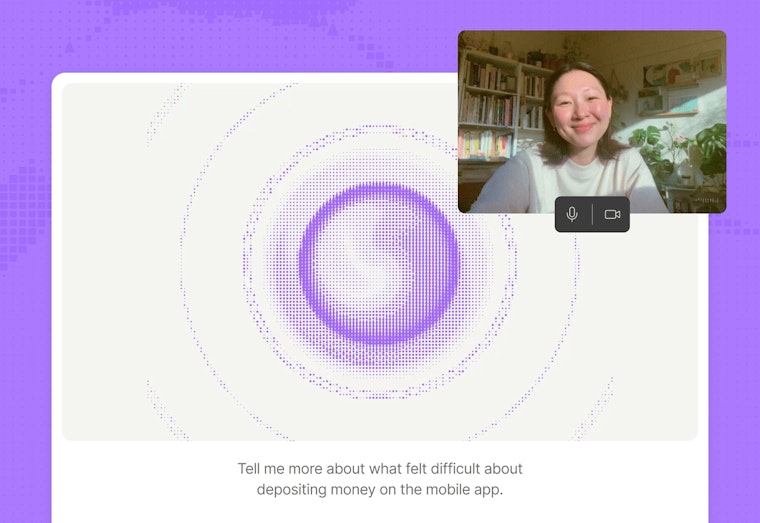 - AI-moderated interviews: Runs 1:1 interviews at scale via video, voice, or text, following your guide and probing dynamically