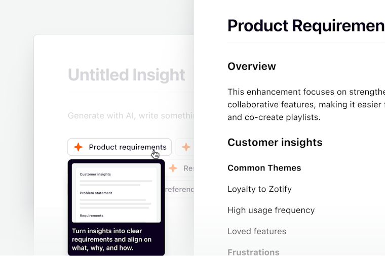 - AI insight aggregator: Clusters large numbers of highlights into themes and generates clear summaries and titles for each insight