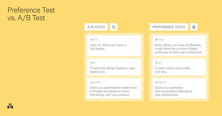 Preference testing is a user research method that involves showing people two or more design variations to understand which they prefer and why. It enables UX and Product teams to evaluate user preference regarding visuals—like layouts, logos, copy, and UI components—early in the design process.