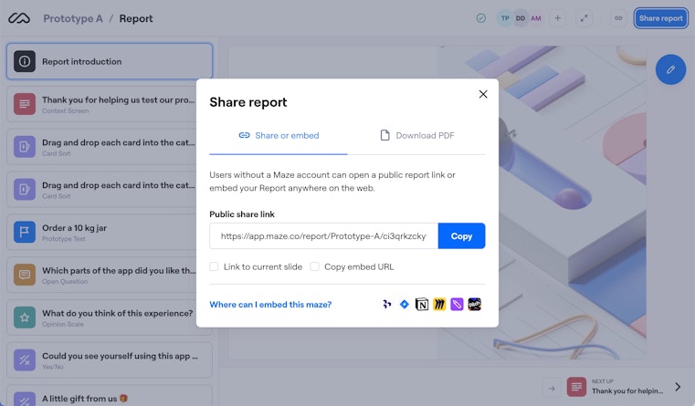 - Written report or shareable link: Use this when your audience is larger, global, or unable to attend live sessions. Maze Reports makes this simple. You can share an interactive link with all stakeholders, add comments, or export a PDF for leadership reviews. This format is especially useful for teams that want to revisit insights over time.