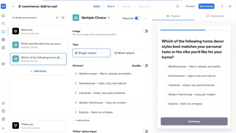 As a best practice, we recommend that you begin your study with a multiple-choice block. This helps participants ease into the session before they start completing tasks or navigating your AI prototype.