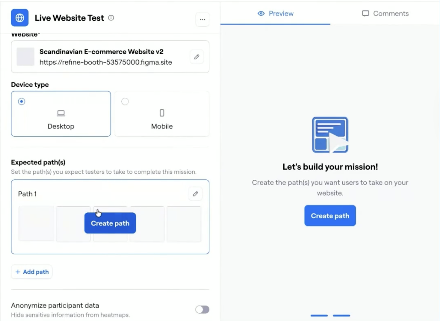 Defining the expected user path in a Live Website Test to track how participants navigate through your AI-generated prototype