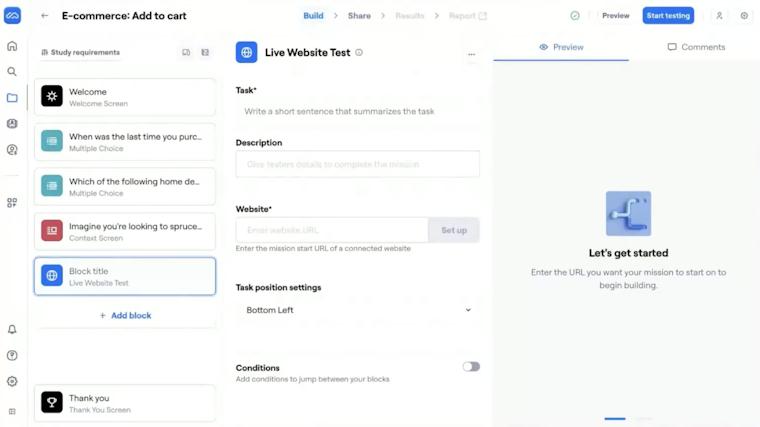 Once your Live Website Test block is in place, you can start expanding your study to capture a complete picture of how users interact with your product. Maze offers a range of testing options that help you move from single-task validation to complete AI product development insights.