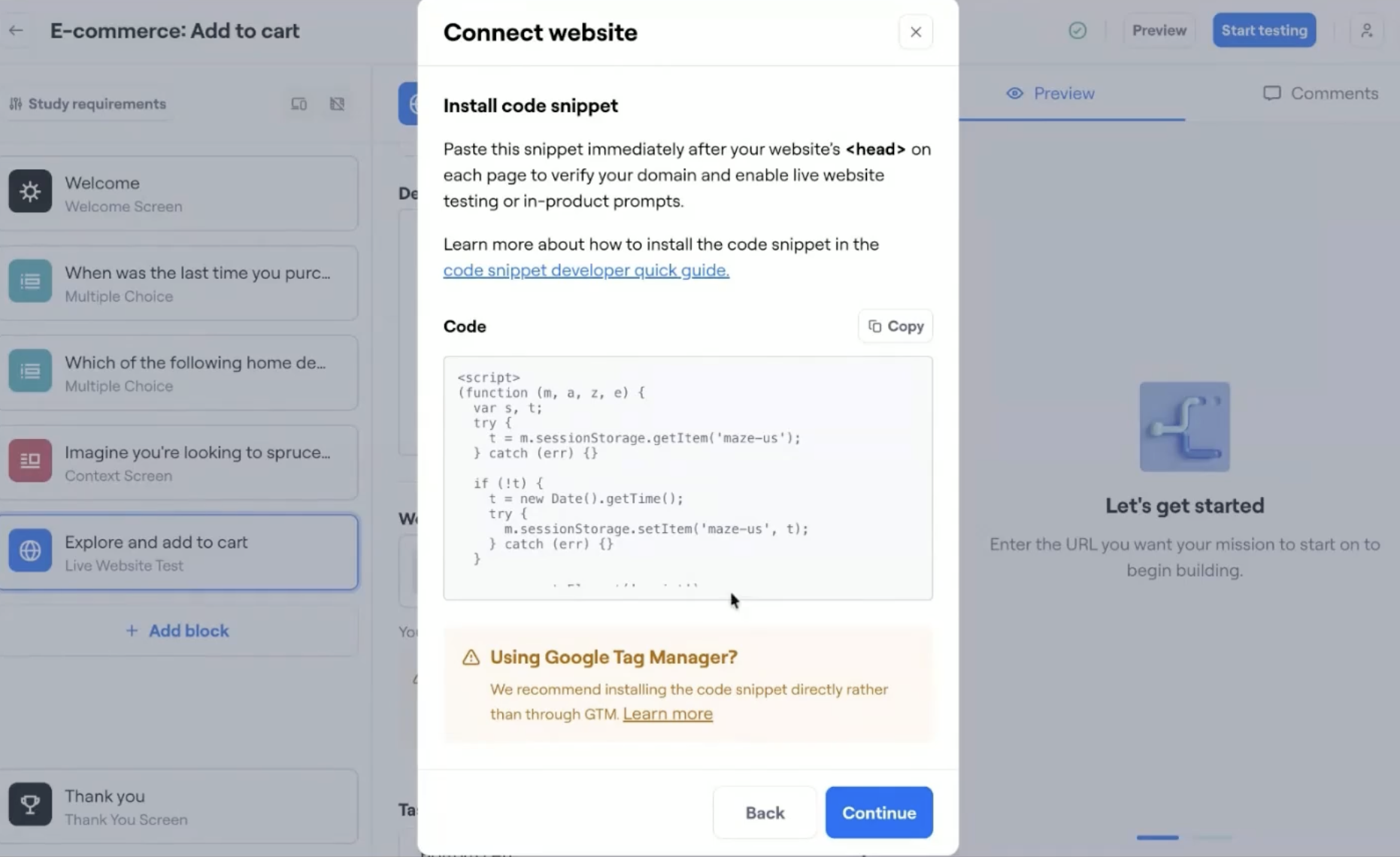 Once verified, you can continue setting up your website testing block by adding the user path you want participants to follow, such as completing a checkout, signing up, or navigating to a feature page.