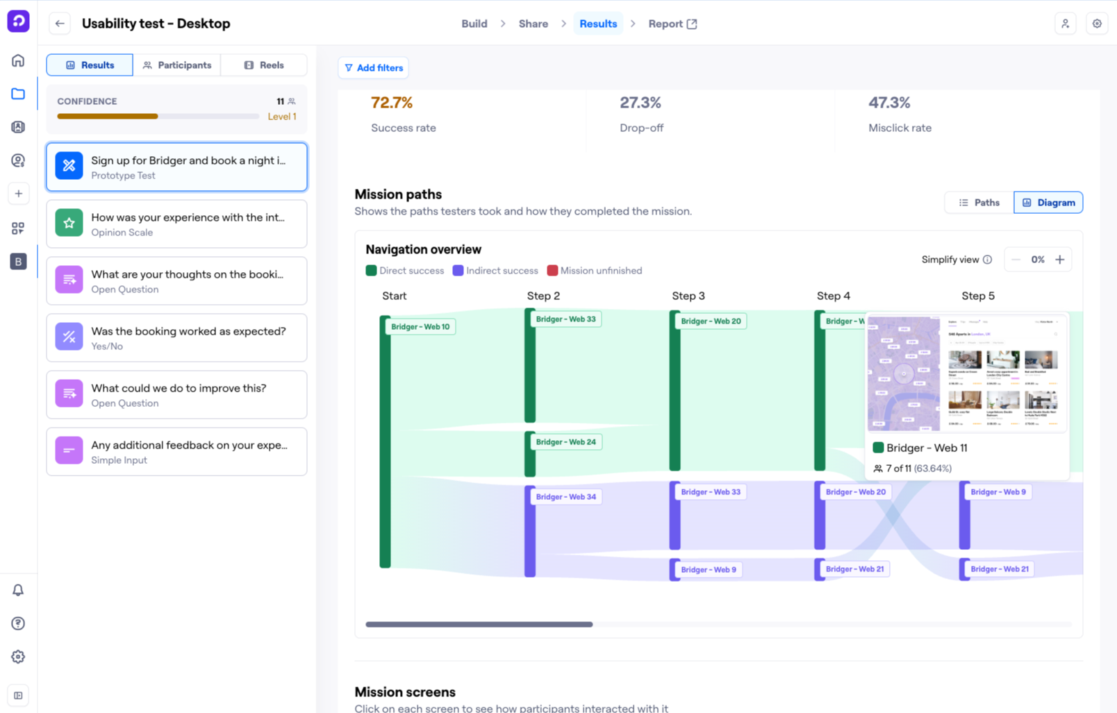 You’ll also get a visual path analysis, showing the exact routes participants took through your AI-generated prototype. This makes it easy to spot where users hesitated or took alternative paths, so you can refine layouts, flows, or copy.