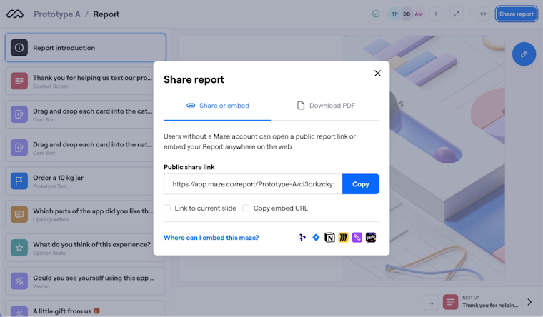 From here, use Maze’s themes and filtering tools to group insights, flag usability issues, and plan your next iteration. You can export reports, share them with your team, or present directly in Maze’s presentation mode to align everyone on the next steps.
